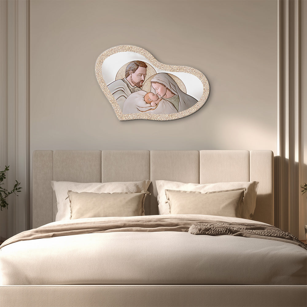 Questo capezzale sacra famiglia è molto più di un semplice complemento d’arredo: è un quadro che racconta amore, protezione e fede.