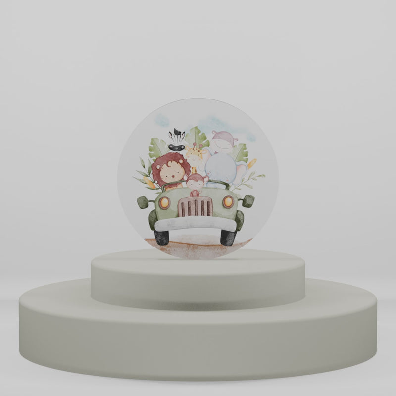 Questo adorabile magnete in legno a tema safari rappresenta la scelta perfetta per chi desidera bomboniere con calamite originali e di qualità. L'illustrazione raffigura un gruppo di simpatici animali della savana a bordo di un'auto vintage color verde salvia, creando un'atmosfera giocosa e avventurosa ideale per celebrare nascite, battesimi o compleanni a tema.